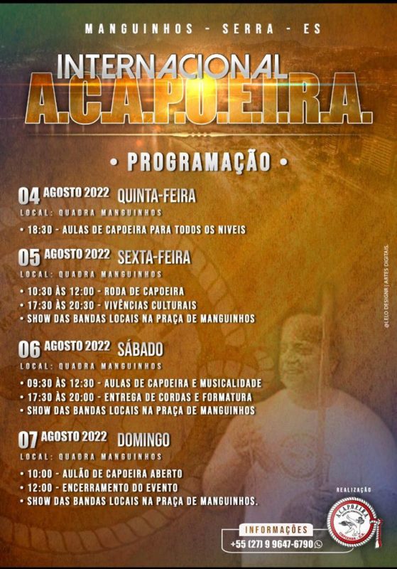 Neste final de semana a Serra vai sediar o Encontro Internacional de Capoeira. Será em Manguinhos, e a organização é do grupo A.C.A.P.O.E.I.R.A. (Associação Cultural Artística Popular Orientada ao Esporte e de Incentivo às Raízes Afro-brasileira) do Mestre Capixaba.