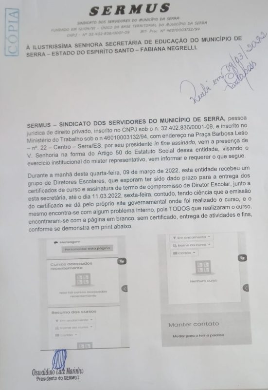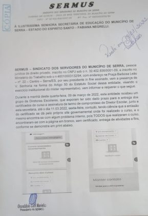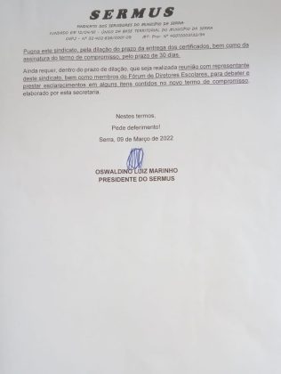 O presidente do Sermus, Oswaldino Luiz Marinho, ouviu os educadores e imediatamente protocolou na Secretaria de Educação da Serra um ofício pedindo mais prazo para que os profissionais em questão possam entregar a documentação exigida, uma vez que o site que emite tais documentos que é governamental está apresentando problemas internos. O prazo inicial é sexta-feira (11) e o sindicato pede mais 30 dias – ou seja, 11 de abril.