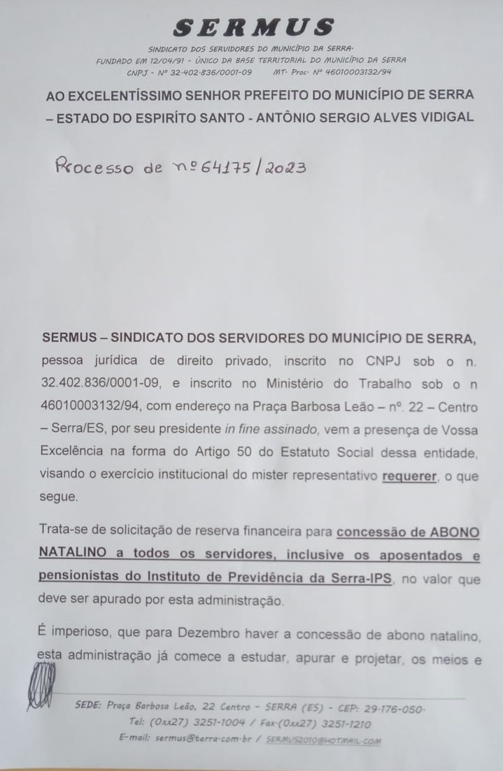 O Sermus – Sindicato dos Servidores do Município da Serra, pessoa jurídica de direito privado, inscrito no CNPJ sob o n 32.402.836/0001-09 e inscrito no Ministério do Trabalho sob o n. 46010003132/94, com endereço na Praça Barbosa Leão – n° 22 – Centro, Serra/ES, por seu presidente in fine assinado, vem a presença de Vossa Excelência na forma do Artigo 50 do Estatuto Social dessa entidade, visando o exercício institucional do mister representativo requerer o que segue.