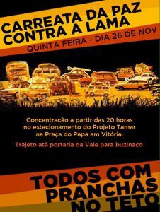A carreata sairá da Praça do Papa e seguirá até a entrada da Vale, que ao lado da anglo-australiana BHP Billiton, é uma das controladoras da  da empresa Samarco, responsável pelo rompimento das barragens de rejeitos de minério em Mariana, Minas Gerais, que causou estrago por mais de 600 km do rio Doce, chegando neste fim de semana ao litoral do estado e ameaçando a vida marinha.
