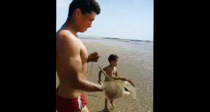 Uma arraia de pequeno porte foi salva por um grupo de banhistas na Prainha, em...