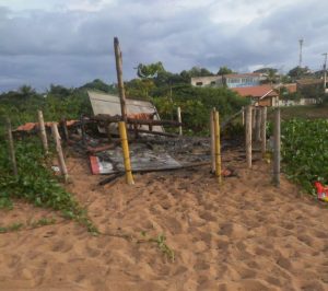 Uma guarita suspensa para salva vidas ao lado da lagoa de Carapebus foi destruída por...