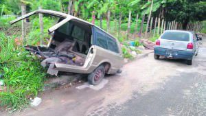 Na rua Amazonas, em José de Anchieta, a metade do que sobrou de um carro...