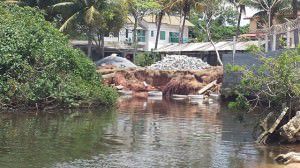 Um muro de propriedade particular que estava sendo reconstruído às margens da foz do Córrego...