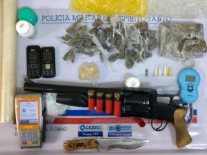 A Polícia Militar apreendeu na madrugada da última segunda (13), uma escopeta calibre 12, drogas...
