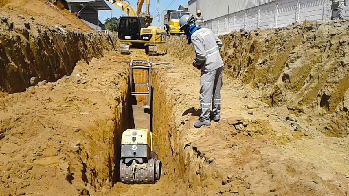 A compactação de valas com grande profundidade é uma das etapas do trabalho de implantação de redes coletoras de esgoto em centros urbanos. Para otimizar a realização dessa atividade, a Serra Ambiental, concessionária que está realizando as obras de esgotamento sanitário na Serra, por meio da parceria público-privada com a Cesan, passou a utilizar na operação um rolo compactador acionado via controle remoto.