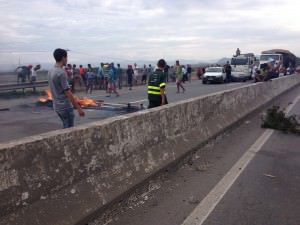 A manifestação começou por volta das 16h30 desta quarta-feira (28). Os dois sentidos da rodovia foram bloqueados e pneus foram queimados.