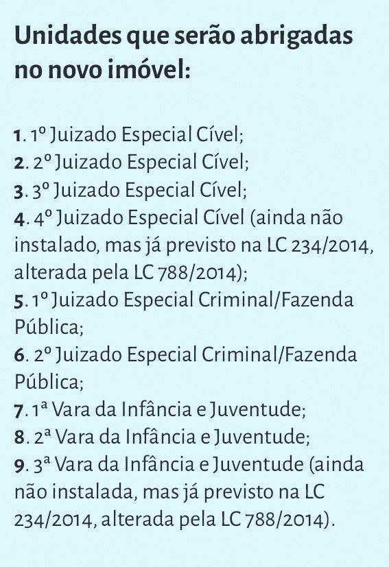 Ainda constam as justificativas pela mudança, como a necessidade de criação de algumas Varas que não caberiam no atual prédio e o fato de haver Varas funcionando em imóveis alugados.