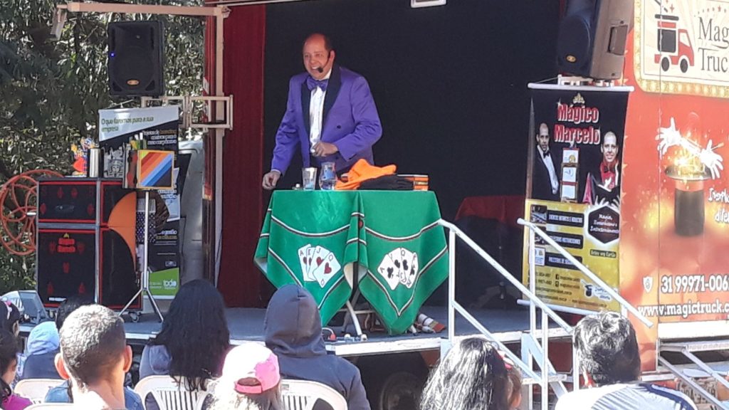 De acordo com informações do Tempo Novo, o caminhão-palco é 100% sustentável, equipado com placas de energia solar e espaço para até 100 cadeiras, além de uma área aberta para acomodar mais espectadores. “O caminhão é 100% sustentável. Agora, ele tem placas de energia solar. É só abrir a porta lateral, e lá está o palco onde apresento o show de mágica”, destacou o mágico Marcelo.