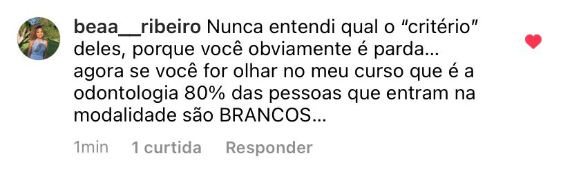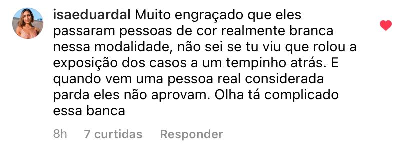 Outra estudante também confirmou que alunos brancos ocupam vagas destinadas para o público pardo. “Muito engraçado que eles passaram pessoas de cor realmente branca nessa modalidade e, quando vem uma pessoa real considerada parda, eles não aprovam. Essa banca está complicada”.