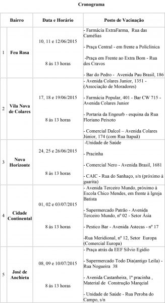 Por lá, a equipe da Vigilância Ambiental em Saúde atenderá das 8 às 13h nos dia 10, 11 e 12 de junho.