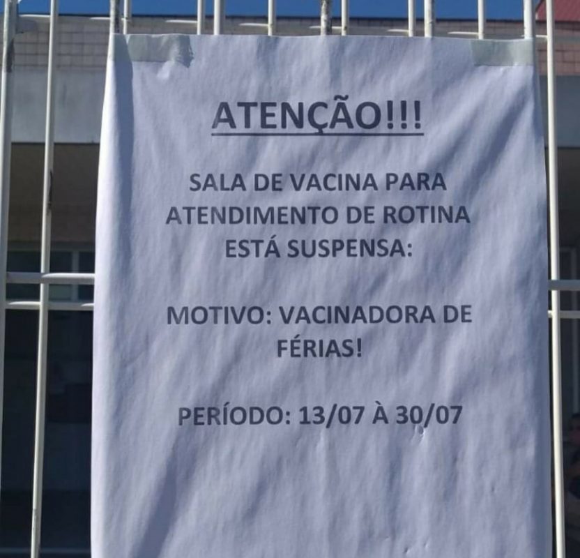 Moradores de Cidade Continental estão revoltados com o fechamento temporário da sala de vacinação da unidade de saúde, que fica o setor América. O motivo, segundo diz o aviso afixado na entrada do estabelecimento é “Atenção! Sala de vacina para atendimento de rotina está suspensa: Motivo: vacinadora de férias – Período 13/07 a 30/07”.