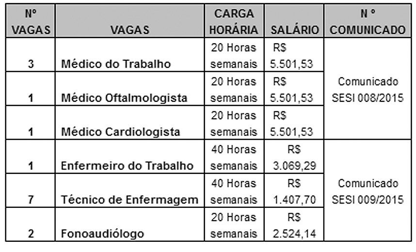 As vagas de emprego são para: Médico do Trabalho (3), Médico Oftalmologista (1), Médico Cardiologista (1), Enfermeiro do Trabalho (1), Técnico de Enfermagem (7) e Fonoaudiólogo (2). As cargas horárias são de 20h a 40h semanais.