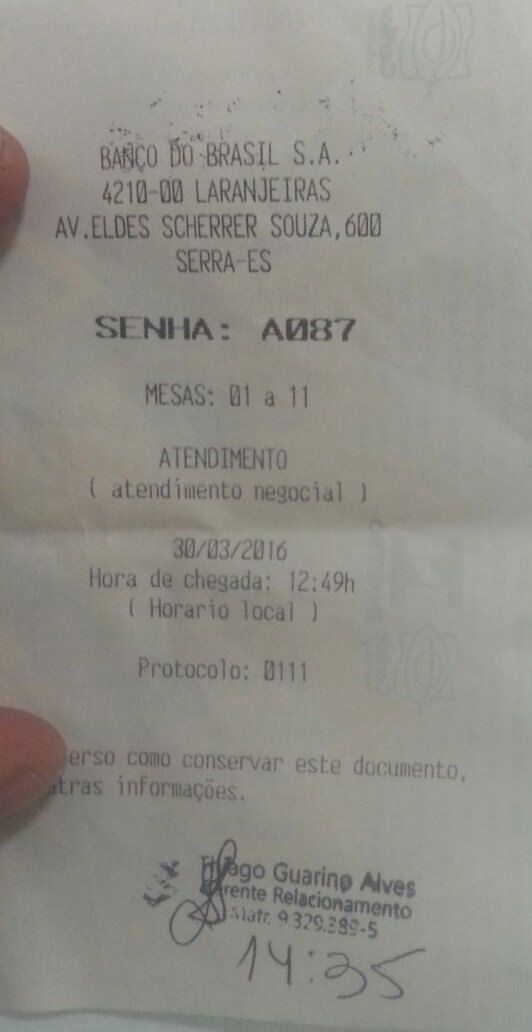 Quase duas horas aguardando atendimento em um banco. Este foi o tempo que o usuário Fernando Vieira da Silva, que é morador de Jardim Limoeiro, esperou para ser atendido no setor de Pessoa Física do Banco do Brasil, em Laranjeiras.