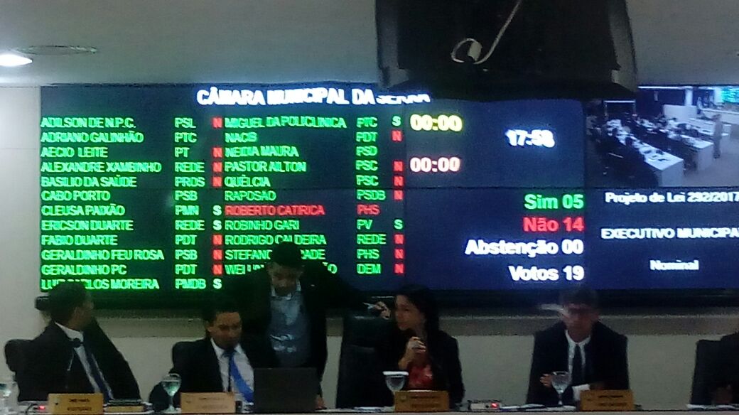 O projeto recebeu os votos favoráveis de Neidia Maura (PSD), Luiz Carlos Moreira (PMDB), Miguel da Policlínica (PTC), Robinho Gari (PV), Adriano Galinhão (PTC) e Ericson Duarte (Rede). A vereadora Cleusa Paixão (PMN) votou favorável, mas informou que havia se equivocado. Com isso, a proposta foi derrubada em plenário, apesar da pressão feita por integrantes da equipe do prefeito, que circularam nos corredores da Casa nos últimos dias.