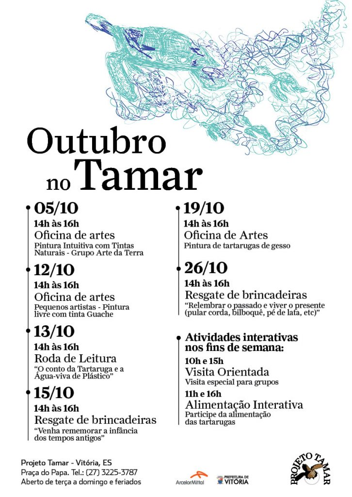 Outubro é o mês das crianças e quem quiser fazer uma programação diferente com o filho, em Vitória, tem agenda repleta de atividades ambientais. É na sede do Projeto Tamar, que ajuda a proteger as tartarugas marinhas no Brasil desde 1980. No Espírito Santo, a sede do projeto fica na Praça do Papa, e vai oferecer pintura de rosto, contação de história, visitas orientadas as tartarugas e ainda alimentação dos animais.