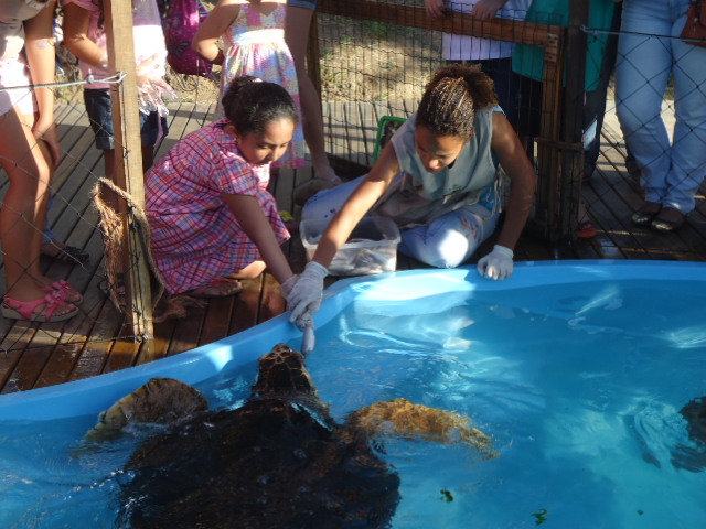 Já às 11h e às 16h, acontece a alimentação interativa, onde crianças e visitantes podem alimentar as tartarugas.