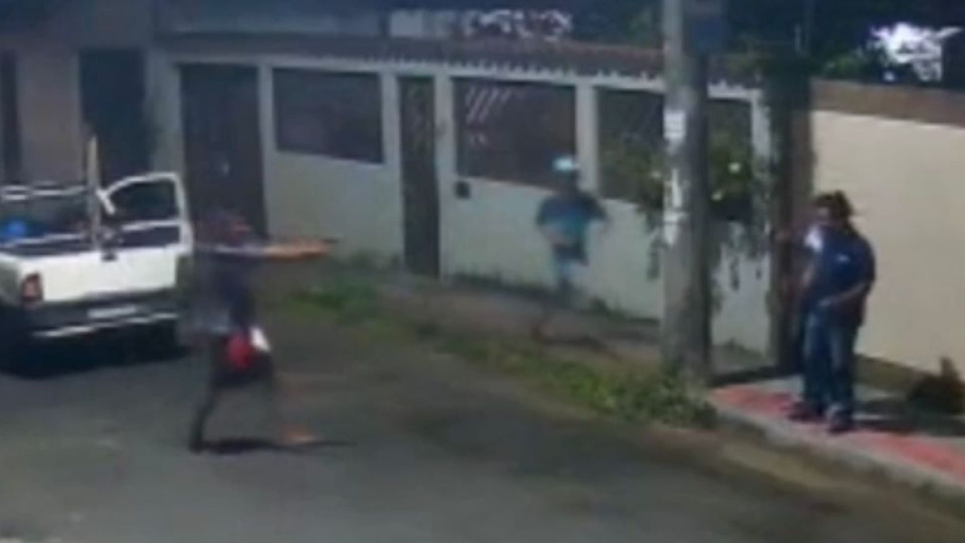 Câmeras de videomonitoramento mostram a ação da dupla de criminosos, que passam num veículo uma pick-up branca, observam as pessoas no ponto de ônibus, dão ré no veículo, param o carro e abordam os trabalhadores. Os dois homens estavam armados.