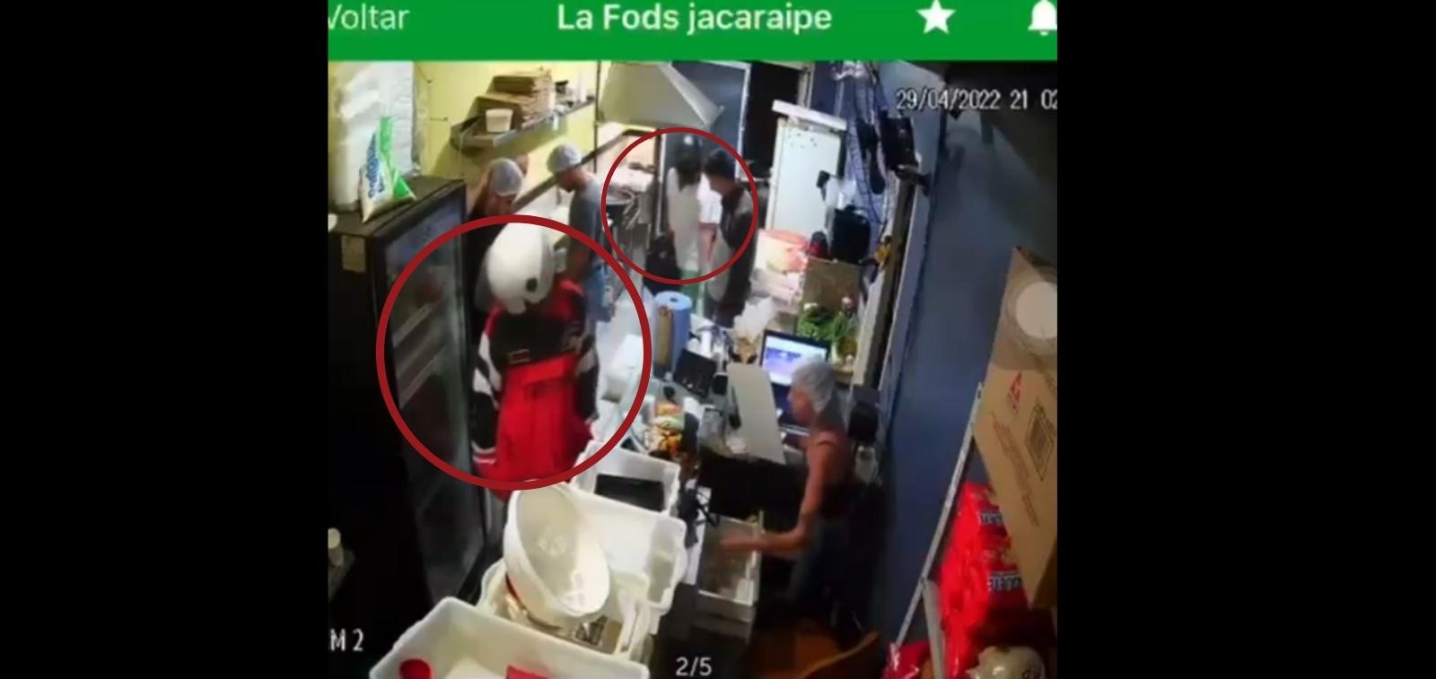 O crime aconteceu as 21h no restaurante La Foods e as câmeras de segurança registraram toda a movimentação dos bandidos.