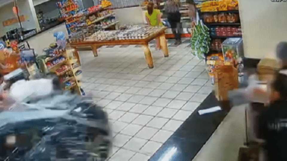 Um homem que pagava as compras no caixa é atingido e arrastado para o fundo da padaria. Clientes e funcionários se assustam com a situação.