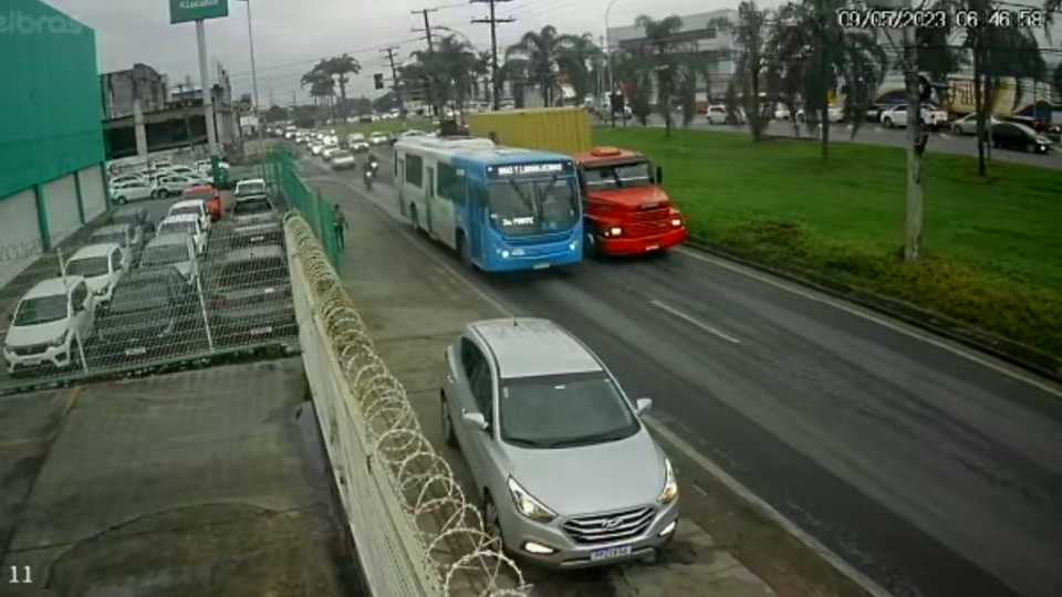 As imagens de videomonitoramento mostram que o motociclista estaria tentando passar entre um ônibus e uma carreta. Possivelmente, no conhecido popularmente como ‘corredor’. Nos primeiros segundos do vídeo, não é possível ver a vítima, apenas os dois veículos de grande porte aparecem.