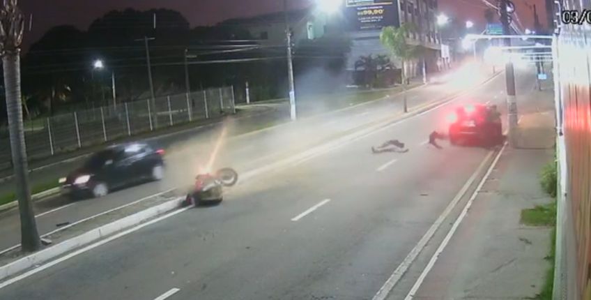As imagens foram registradas por volta das 5h37 e mostram ainda que assim que foi atingido pelo carro que estava indo no seu mesmo sentido, o motociclista foi lançado para a pista sentido Vitória x Serra, onde sofreu uma segunda batida.