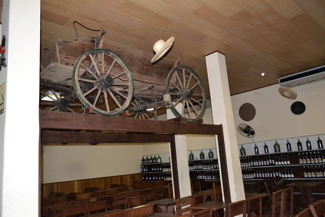 Para acompanhar bebidas e petiscos, um ambiente climatizado e decorado no estilo rústico. Tem carroça, barril de cachaça gigante, peneiras e chapéu de palha. “A carroça veio do Rio Grande do Sul e faz parte da decoração da Adega há mais de quinze anos”.