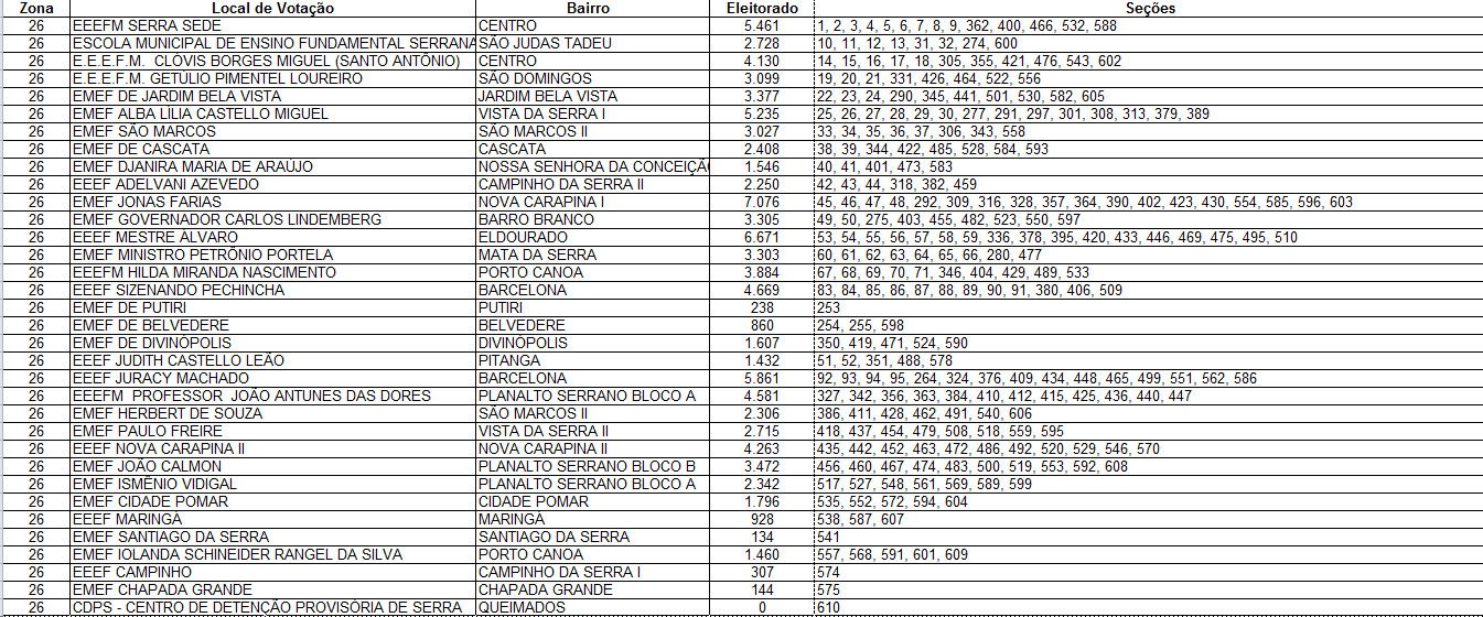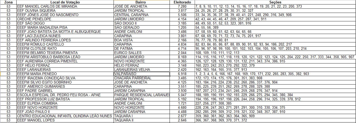 Confira na tabela abaixo o seu local de votação: