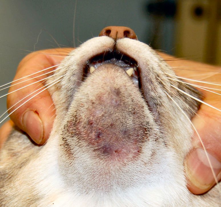 Em gatos persas a condição também pode afetar o rosto e as dobrinhas da pele. Complicações da acne normalmente ocorrem em gatos brancos, ou com o queixo clarinho, mas gatos de qualquer cor podem ter acne, então fique atento, se o seu gato é preto ou de uma cor mais escura e você não consegue somente visualizar os cravinhos, como na foto abaixo, passe gentilmente a ponta da unha no queixo do seu gatinho para tentar sentir qualquer pontinho.