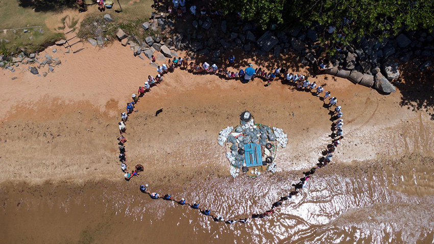No total, foram recolhidos 316 quilos e 435 gramas de lixo da praia em apenas 40 minutos de ação. Depois de todo o lixo recolhido, os voluntários fizeram um abraço simbólico em volta do que foi retirado. “Depois que terminamos a limpeza da orla, fizemos um abraço simbólico em volta do material retirado e depois desenhamos uma tartaruga com o lixo recolhido como forma de sensibilizar os frequentadores do nosso paraíso. Foi lindo, foi incrível, foi divino! A praia estava linda, a maré baixa e o sol radiando”.